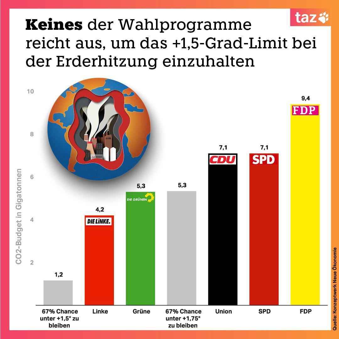 Aber in jedem jetzt möglichen Regierungsbündnis säßen mindestens zwei Parteien, deren Wahlprogramme nicht für Deutschlands Beitrag zur Begrenzung der Erderhitzung bei 2 Grad ausreichen, von 1,5 Grad ganz zu schweigen.