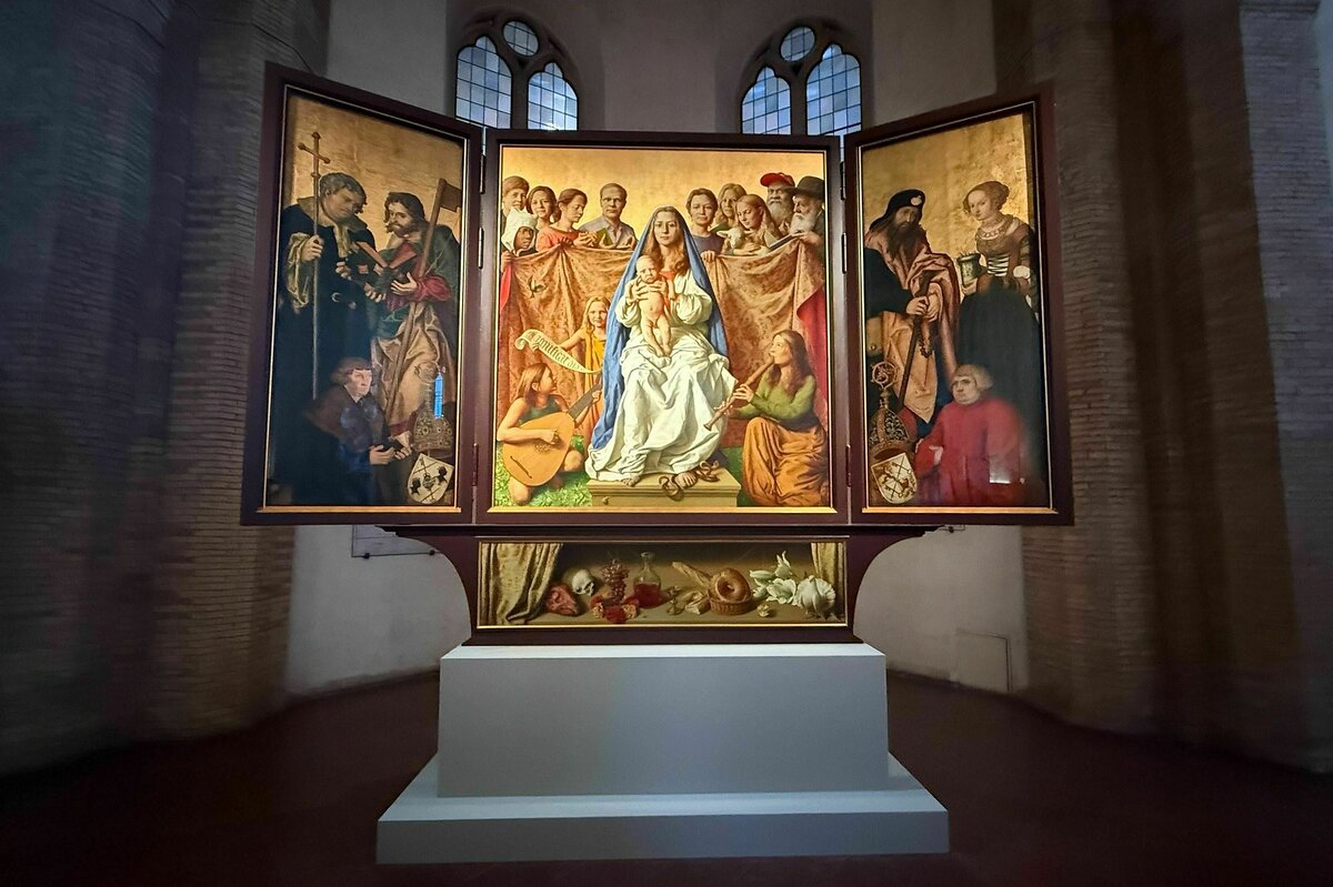 Pilgerschaft von Ausstattungsstücken aus Kirchen ist kein Novum, wohl aber die Vorgeschichte dieses Exils: Zwischen 1517 und 1519 schuf Lucas Cranach d. Ä. für den Westchor des damals noch katholischen Doms einen dreiflügeligen Marienaltar: im Mittelteil vermutlich eine Marienszene, auf den Seitenflügeln Heilige und StifterInnen. Den Reformatoren galt Marienverehrung dann als Frevel. Der Mittelteil überstand deren Bildersturm 1541 daher nicht, der Dom wurde protestantisch.