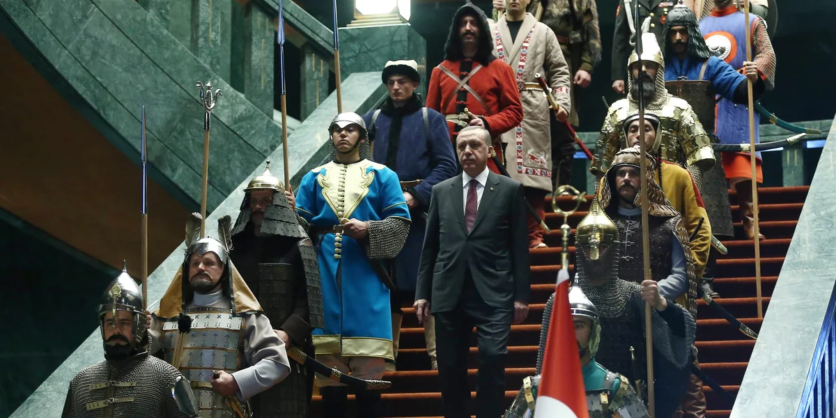 2014 yılında tamamlanan ve birçok tartışmaya yol açan Cumhurbaşkanlığı Sarayı ile „saray“ ve „külliye“ kelimelerini gündelik dile geri getiren Erdoğan'ın, Filistin Devlet Başkanı Mahmud Abbas’ın ziyaretinde sergilediği görüntüsü birçok Türkiyeli tarafından garipsendi. Erdoğan sarayın merdivenlerinde, Türkiye topraklarında kurulmuş ve yıkılmış 16 devletini temsil eden sözümona tarihi giysili askerler ile poz verip, ülkenin politik geleceğini nasıl şekillendirmek istediğini Türkiye’ye ve dünyaya gösterdi.