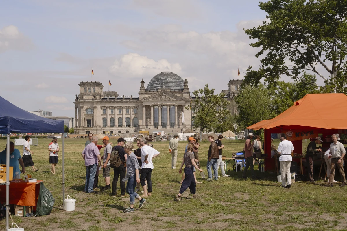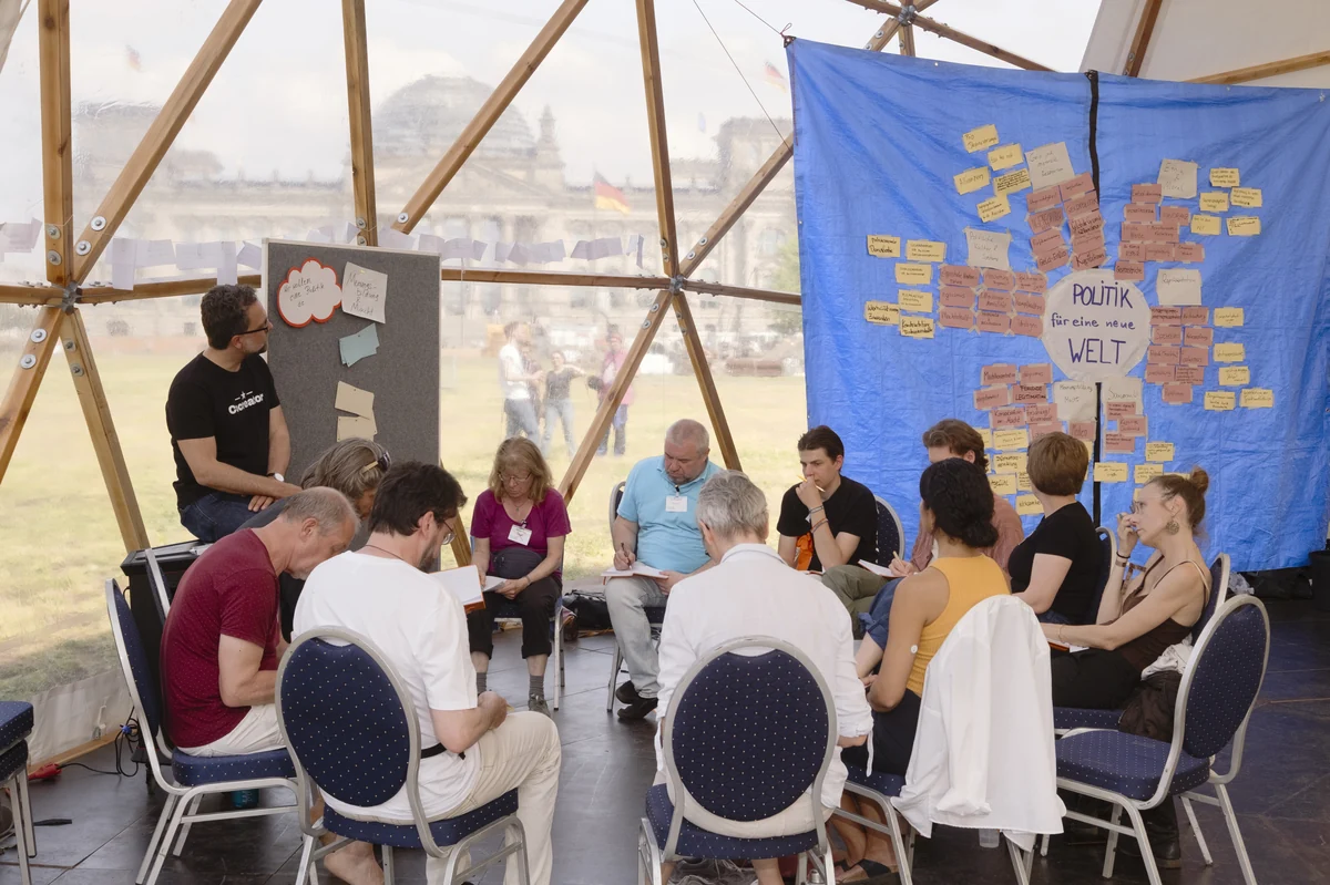 Um zu beweisen, dass das mit dem Bürgerrat eine gute Idee ist, hat die Neue Generation ein imposantes Kuppelzelt auf die Wiese vor dem Bundestag gekarrt. Für den Auftakt des Wochenendes hat die Neue Generation neben Jascha Rohr gleich eine ganze Reihe von politischen B-Promis gewinnen können.