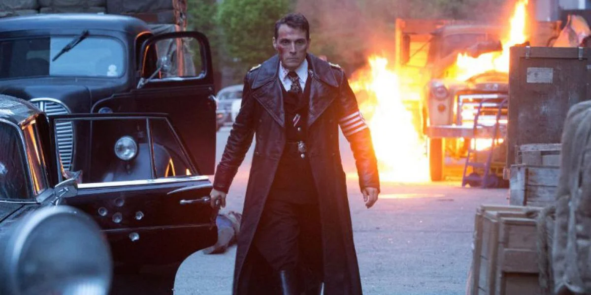 Auf den ersten Blick ist es der übliche Aufschwungsenthusiasmus der 1960er Jahre, der Nazi-Spion Joe Blake (Luke Kleintank) von der Leinwand entgegen flimmert: Strahlende Gesichter, startende Raketen, fliegende Adler. Erst die Flagge lässt stutzen: Anstelle der „Stars“ auf den „Stripes“, also der Sterne für die US-Bundesstaaten zeigt die amerikanische Fahne ein Hakenkreuz. Ein Mann setzt sich neben Blake und drückt ihm einen Zettel in die Hand mit einer Adresse. Blake läuft los, durch die Nazis-Patrouillen in den Straßen.