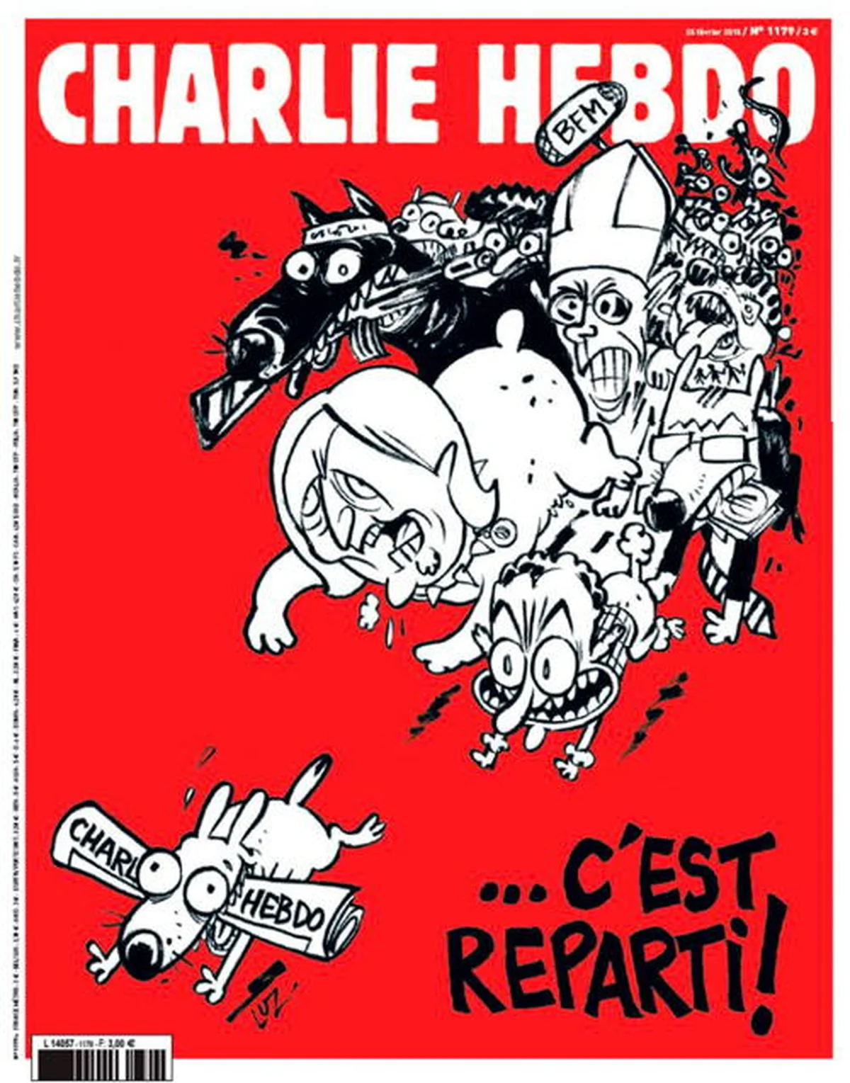 Die Karikatur zeigt eine Meute von Hunden, einige von ihnen mit Gesichtern von FN-Chefin Marine Le Pen, Ex-Präsident Nicolas Sarkozy, einem bewaffneten Islamisten und Papst Franziskus, die allesamt einen kleinen Köter hetzen. Die Mischung aus Struppi und Idefix jagt mit einem Charlie-Hebdo-Exemplar im Maul davon. „Ich wollte beim Zeichnen zurück zur fröhlichen Kritik von Charlie Hebdo“, sagte Luz über die Karikatur im Sender France Info.