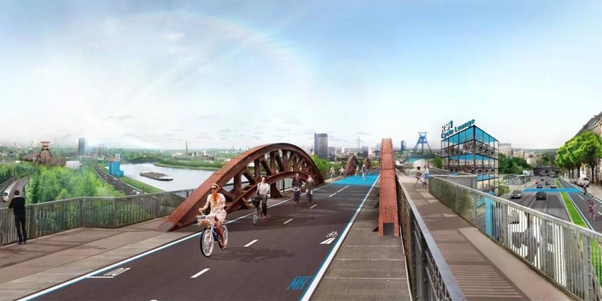 Mit der Fahrradschnellverbindung zwischen Essen und Mülheim nimmt ein für Deutschland wegweisendes Infrastrukturprojekt seinen Anfang. Das Ziel ist ein über 100 Kilometer langer Radhighway quer durchs Ruhrgebiet – von Duisburg über Essen, Bochum, Dortmund bis nach Hamm – der sich in das regionale Radwegenetz integriert.
