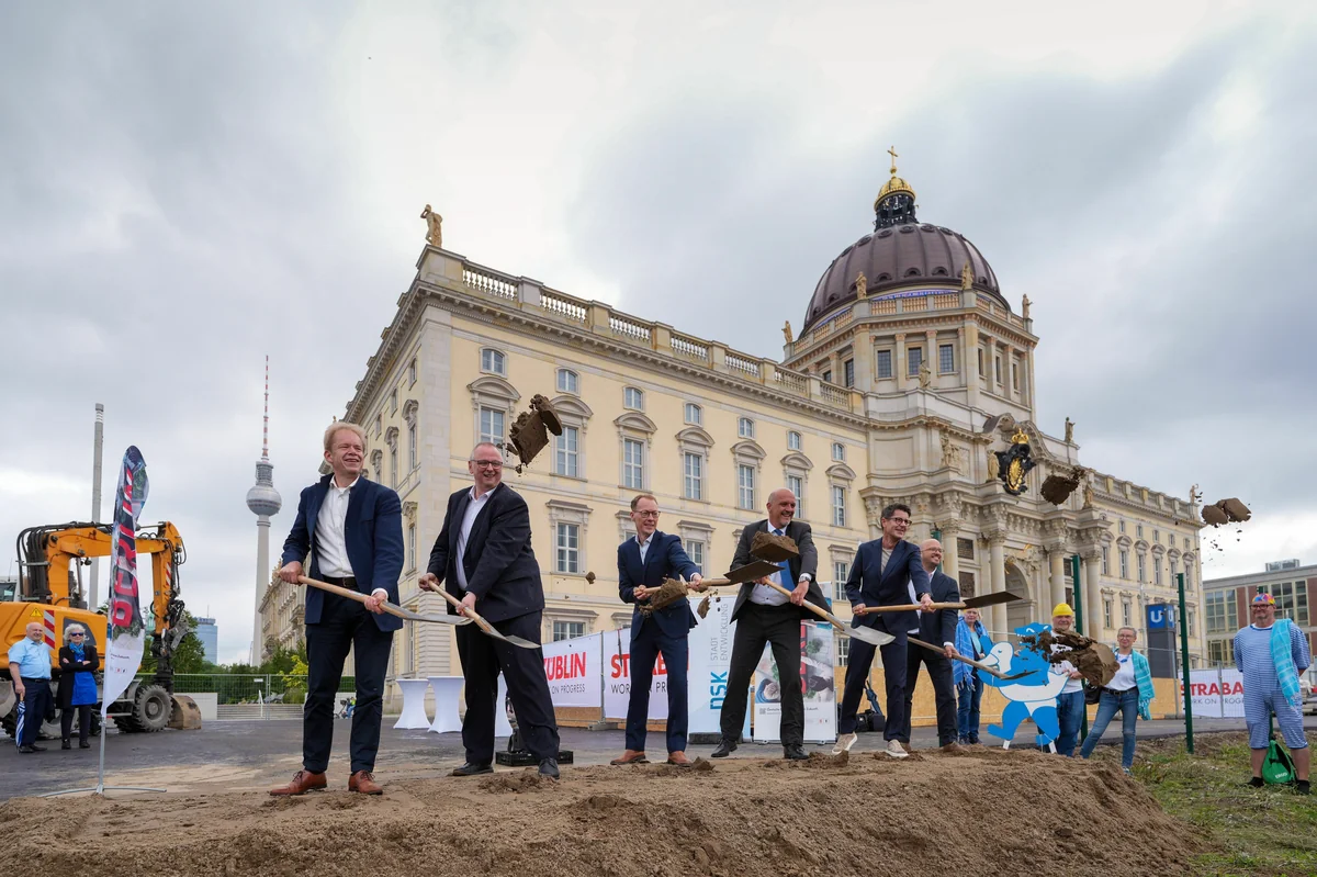 Unmittelbar am Humboldt-Forum sollen Menschen in zwei Jahren an der Spree sitzen und feiern können. Auch das Flussbad war beim Spatenstich dabei.