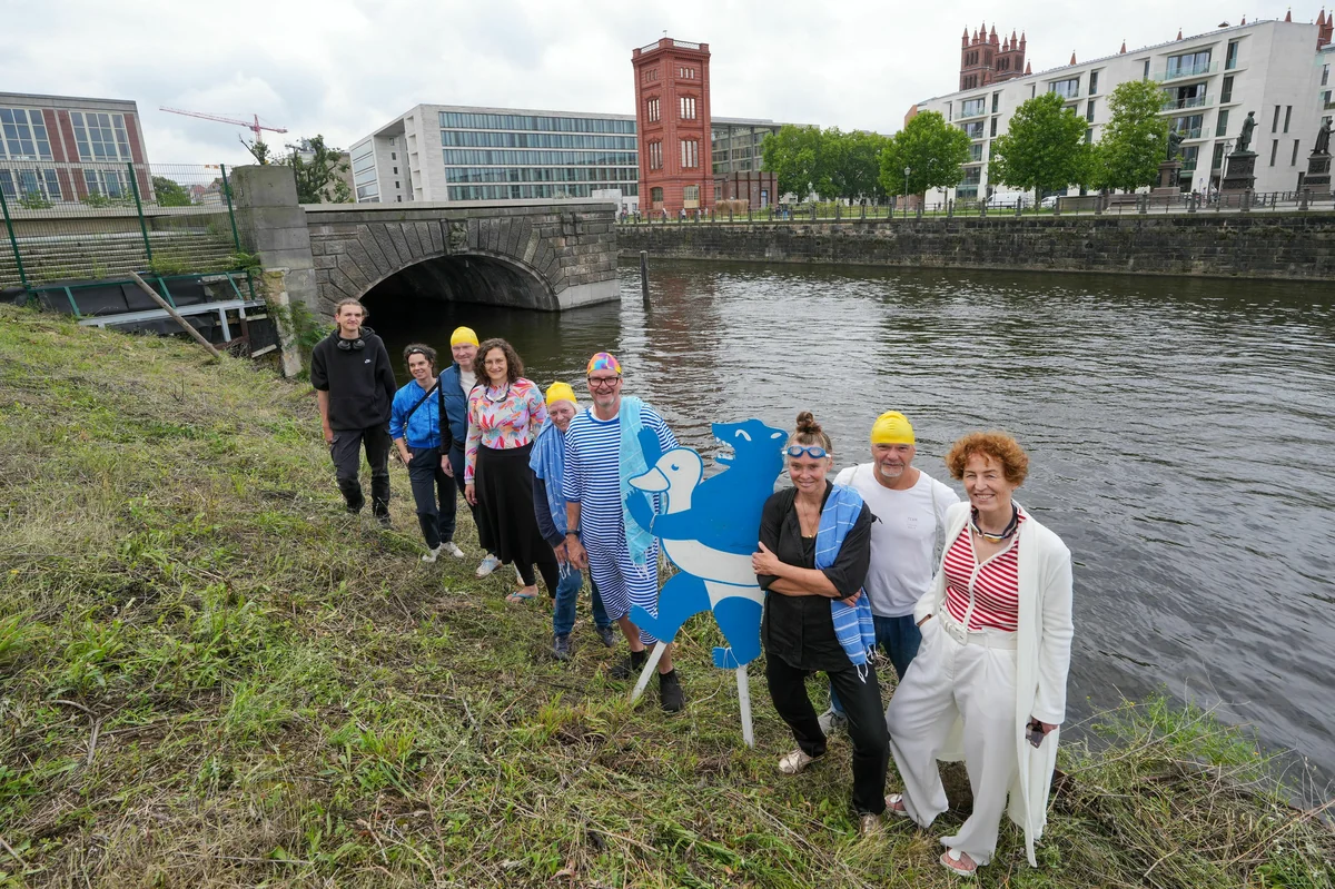 Dass die Freitreppe ursprünglich auch Teil des geplanten Berliner Flussbads sein sollte, erwähnten weder Olaf Joachim noch Berlins Baustaatssekretär Stephan Machulik (ebenfalls SPD). Allerdings war das Flussbad auch beim Spatenstich präsent. Mehrere Mitglieder des Vereins waren gekommen, einer trug einen gestreiften Badeanzug und eine Quietscheente mit Berliner Bär.