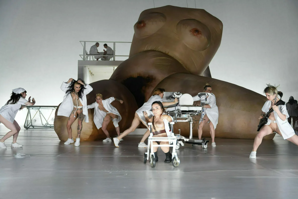 Eine Frau in Alltagskleidung tanzt zu morbider Musik über die Bühne, immer mehr Frauen unterschiedlichen Alters gesellen sich dazu. Sie umarmen sich, ziehen sich gegenseitig aus, haben Sex mit einem Strap-On. Der nebelverhangene Scheinwerfer wird greller, und ein riesiger Torso bläst sich auf. Die Frauen umringen Holzinger, die eine Geburt nachahmt. „Inhale!“, rufen sie im Chor, „exhale!“, auf den Displays wird ein winziger, transparenter Embryo aus einer menschlichen Wunde geborgen.