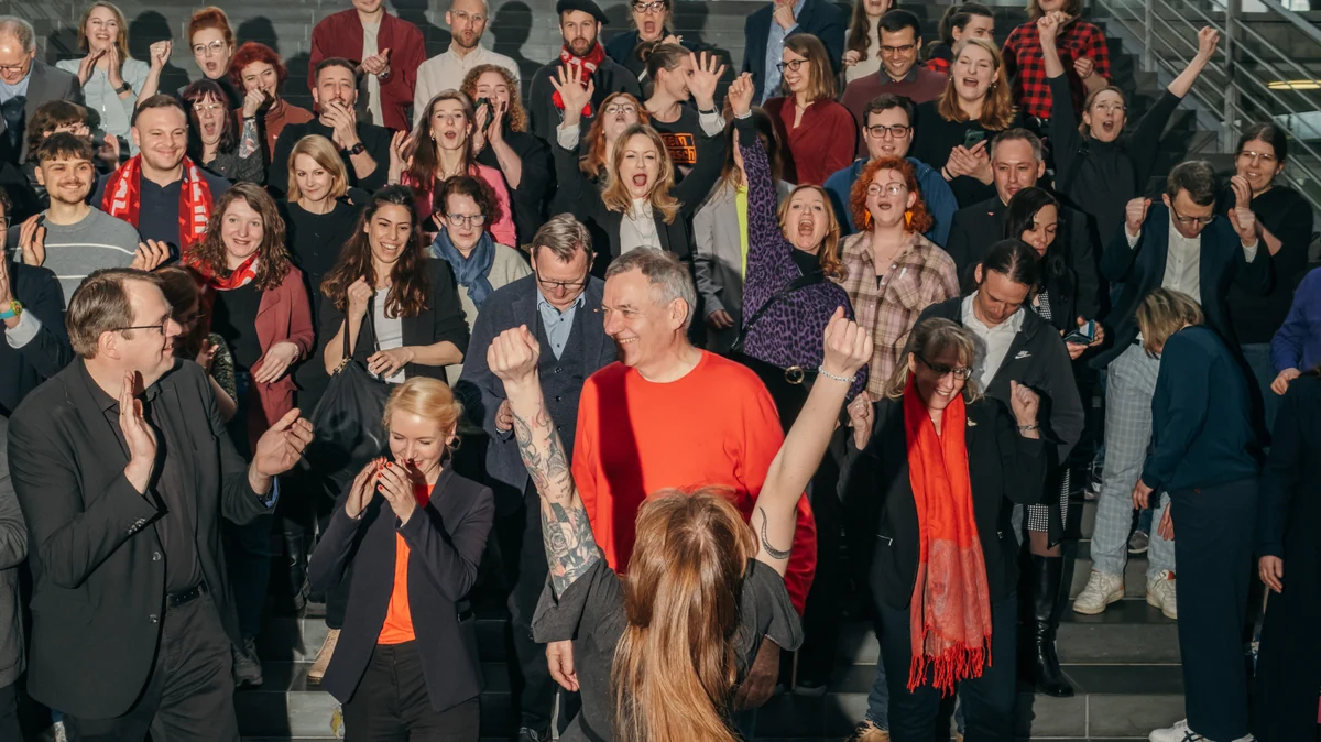 Cansın Köktürk stimmt ein, Bodo Ramelow, Ex-Ministerpräsident von Thüringen, tritt etwas verlegen von einem Bein auf das andere. Ex-Parteichefin Janine Wissler steht schweigend am Rand.