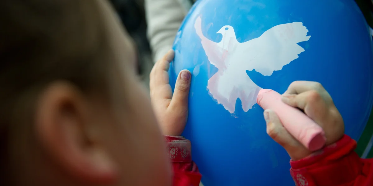 In der Ruhrgebietsstadt Essen hängt das Schild der „Friedensbewegung 2014“ an einem Backsteinbau über dem zentralen Kennedyplatz. Die Moderatorin trägt ihre Dreadlocks zum Zopf gebunden. Sie kündigt an: ein Friedenslied mit Gitarre.