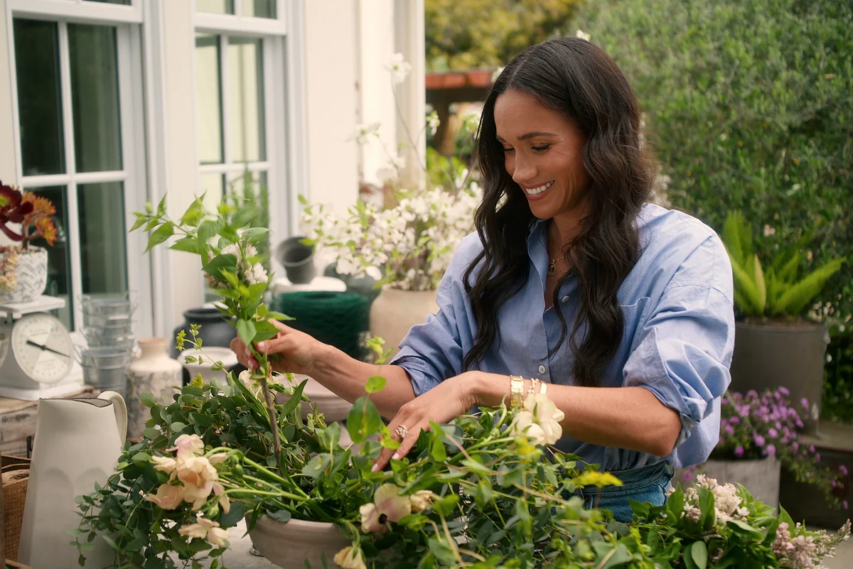 Meghan präsentiert sich als zugewandte, dekodampfplaudernde Gastgeberin für Freund:innen aus ihrer Vergangenheit (Make-up-Artists, Schauspielkolleginnen wie Mindy Kahlig) und ihrer erstaunlichen Gegenwart (Sterneköchin, Nachbarin, „Polofreundin“, „Farm-to-table-movement-Pionierin“), mit denen gebacken, gekocht und enthusiastisch verschönert wird. Ein Zwischentitel lautet „How to style crudités“, etwa „Wie man Rohkost anrichtet“.