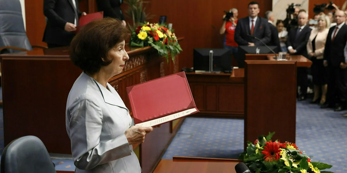 Um Schlag 12 Uhr am Sonntag legte die haushohe Siegerin der jüngsten Präsidentschaftswahlen in Nordmazedonien, Gordana Siljanovska-Davkova, im Parlament in Skopje ihren Amtseid ab. Dabei las ihr der Parlamentspräsident den Text vor, das neue Staatsoberhaupt hielt zudem die Urkunde aufgeschlagen mit dem identischen Text in ihren Händen.