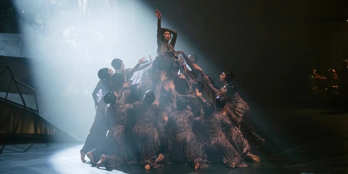 „Ton ab“, ruft einer aus dem Hintergrund. Die Schauspielerin Betty Winter, dargestellt von der polnischen Jazzsängerin Natalia Mateo, reißt eine Faust in die Luft. „Wir sind ein Schweif des gestrigen Zaubers“, singt sie. Im Hintergrund fliegen dank großer Trampoline androgyne Tänzerinnen mit Glitzerkappen durch die Luft. Die Kulissen erinnern an die zersplitterten, kubistischen Gemälde eines Franz Marc oder Ernst Ludwig Kirchner. Aber auch das abstrakte Dekor des expressionistischen Films „Das Cabinet des Dr. Caligari“ von Robert Wiene aus dem Jahr 1920 wird zitiert.