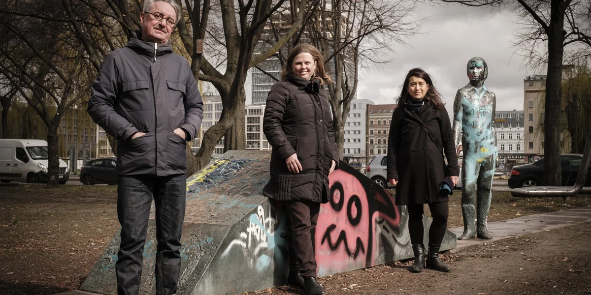 Natalie Bayer und Clara Herrmann sind zusammen mit Stéphane Bauer, Leiter des Fachbereichs Kultur und Geschichte im Bezirksamt, zum Schlesischen Tor gekommen, um der taz ihr Konzept vorzustellen. Der Ort sei nicht zufällig gewählt, erklärt Bauer. „Dort entstand 1987 die Skulptur Menschenlandschaft als Kooperationsprojekt von sieben Künstlerinnen und Künstlern.“ Einer von ihnen war der Bildhauer Mehmet Aksoy, der in West-Berlin den türkischen Künstler- und Akademikerverein gegründet hatte. Hervorgegangen war die Initiative zur „Menschenlandschaft“ von der Internationalen Bauausstellung IBA-Altbau.