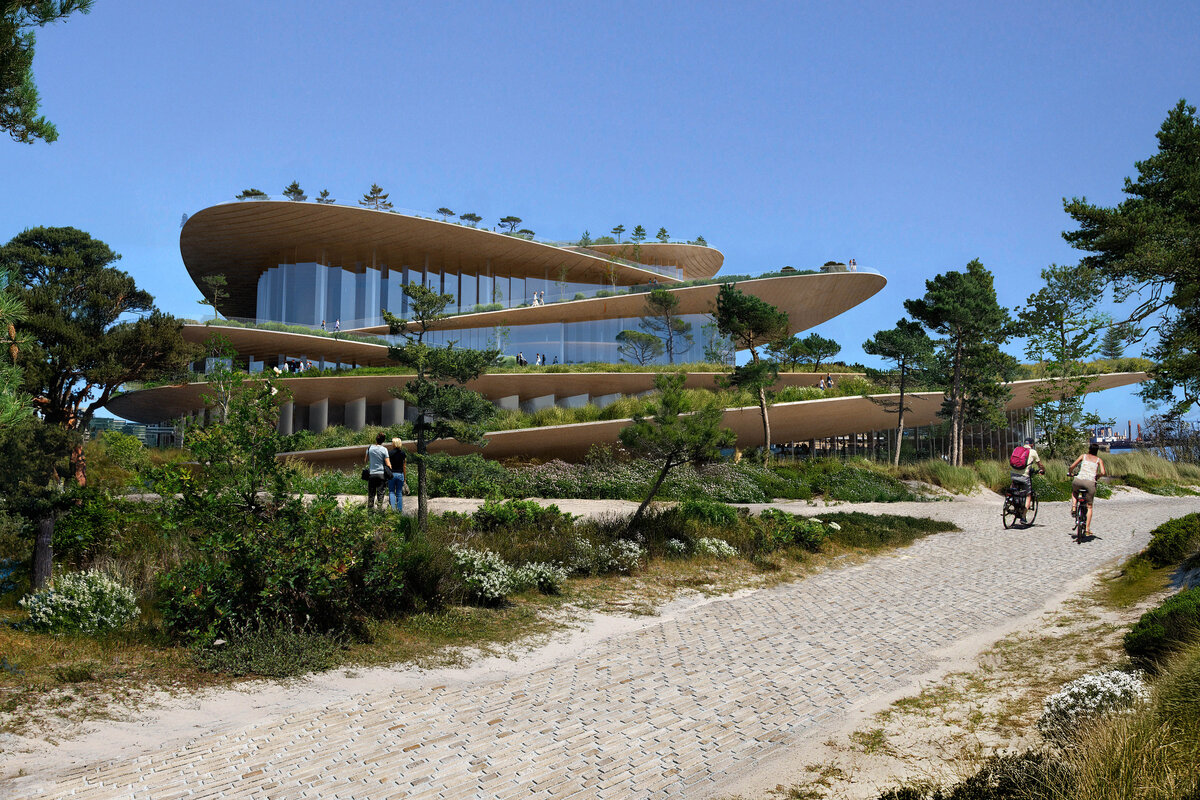 Die Terrassen des Gebäudes setzen sich zur Landspitze hin fort – bis hin zu einem Bereich, der im Falle einer Sturmflut überspült würde. Hier schlagen die Architekten eine ufertypische Bepflanzung vor, hinter dem Gebäude ein Küstenwäldchen. Ingels und seine Kollegen schufen damit eine Landschaft, die aber zugleich deutlich als Gebäude erkennbar ist. Oberbaudirektor Höing nannte es ein Haus, das es schaffe, den prominenten Ort zu besetzen, „ohne vordergründig laut zu sein“.