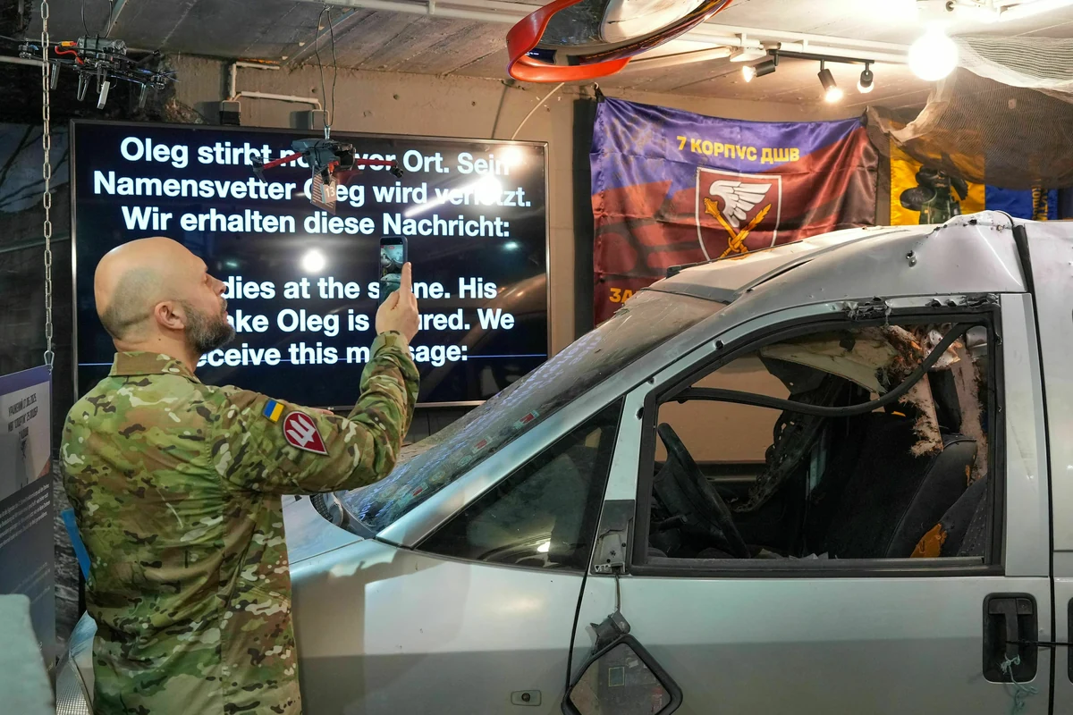 Die Ausstellung sollte eigentlich schon im vergangenen September eröffnet werden, aber ein wichtiges Exponat fehlte damals noch: ein Kleinbus, der durch einen russischen Drohnenangriff beschädigt wurde. Bei dem Vorfall kam einer der Insassen ums Leben. Jetzt steht der zertrümmerte Wagen im Museum. Dahinter läuft ein Video, es zeigt den Angriff und die letzten Momente im Leben des Todesopfers.