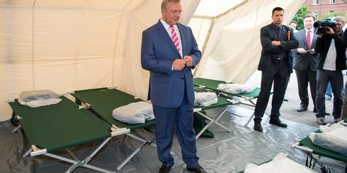 Es sind einwandige weiße Hauszelte mit Lüftungsklappen und grauer Bodenplane, die dort hinter der Schmidt-Knobelsdorf-Kaserne in Spandau stehen, wo tags zuvor nur leerer Asphalt war. 71 sind es, jedes soll zehn jener Flüchtlinge einen Schlafplatz bieten, die in den nächsten Tagen in Berlin erwartet werden. Wann genau das passiert, weiß noch keiner an diesem Donnerstagmorgen, als Innensenator Frank Henkel (CDU) vor Ort ankommt und sich die Notunterkunft anschaut. Er und Regierungschef Michael Müller (SPD) haben die Zeltstadt erst am Mittwochnachmittag als Reaktion auf den absehbaren Zustrom aus Budapest angekündigt und erwägen zudem, auch zwei Hangars des Exflughafens Tempelhof zu nutzen.