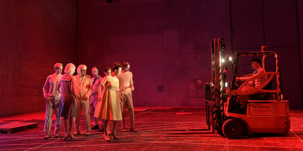 Herbert Fritschs Stück kommt sehr erfrischend ohne Gedankenschwere aus. Dafür gibt es Gabelstapler, Klettergurte und sehr oft ein „Hä“.