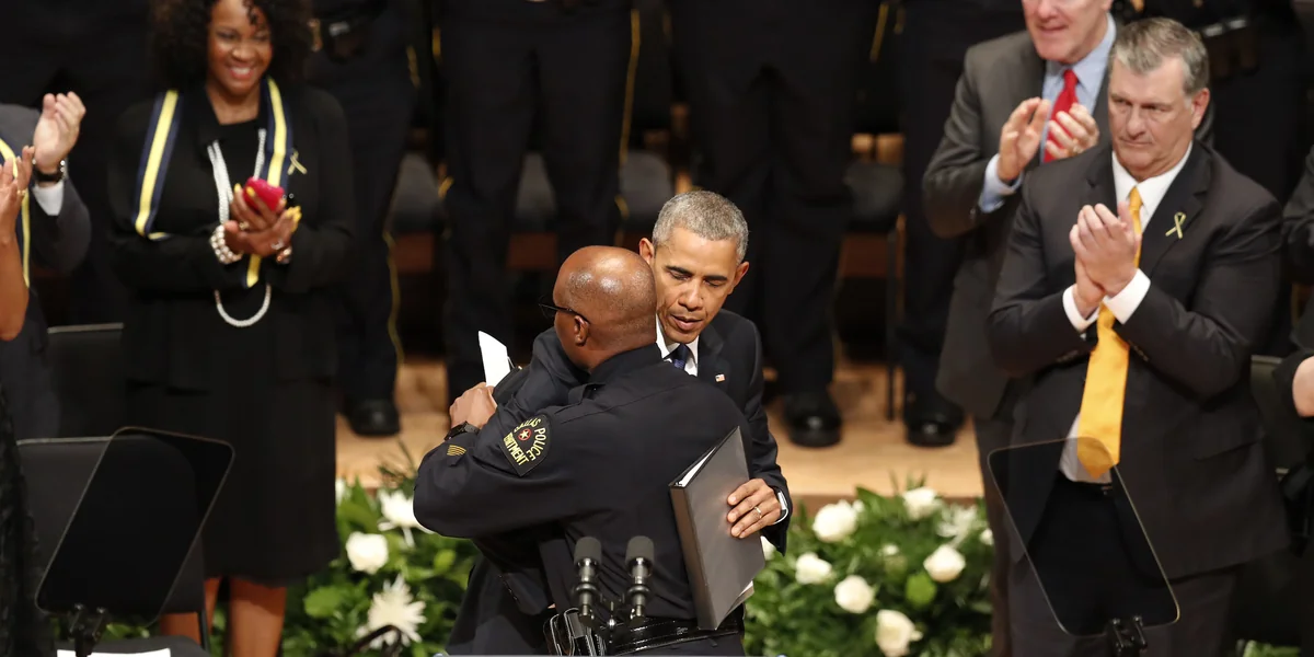 Fünf leere Stühle, die Sitzfläche geschmückt mit je einer gefalteten Flagge, eine Polizeimütze auf der Lehne, erinnerten an fünf in der Vorwoche in Dallas erschossene Polizisten. „Der Schmerz von Dallas ist der Schmerz der Nation“, sagte Dallas' Bürgermeister Mike Rawlings zu Beginn. An Obama und Bush gerichtet, sagte Rawlings: „Sie sind gekommen, um unsere Wunden zu heilen.“