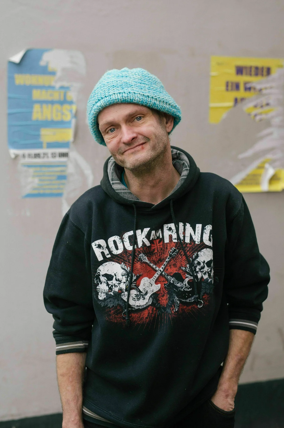 Einer der Männer heißt Stefan Lutze. Er trägt eine türkisfarbene Wollmütze auf dem Kopf und einen Hoodie von „Rock am Ring“. Momentan sei er wohnungslos, arbeite als Fensterputzer und komme in der Notschlafstelle „Alter Flughafen“ unter, erzählt er. Wegen seiner Arbeit habe er sich für eine Impfung entscheiden müssen, sagt Lutze. Außerdem sei er Diabetiker und deswegen besonders gefährdet.