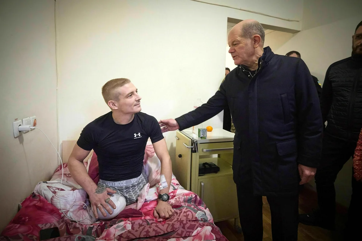 Unmittelbar nach seiner Ankunft besuchte Scholz gemeinsam mit Selenskyj ein Krankenhaus, in dem verwundete ukrainische Soldaten behandelt werden. Anschließend legten die beiden Politiker Blumen am Gedenkplatz für die gefallenen ukrainischen Soldaten auf dem Maidan nieder.
