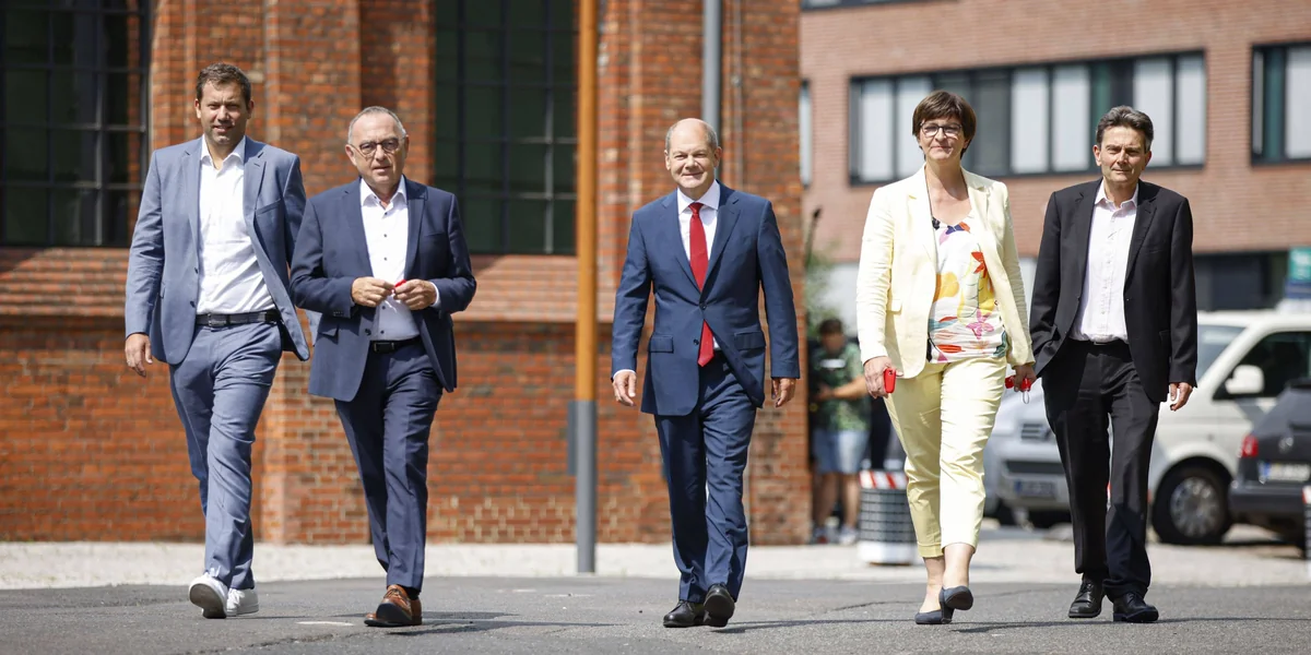 Olaf Scholz steht in der Mitte, rechts von ihm Norbert Walter-Borjans, links Saskia Esken. Scholz trägt staatsmännisch einen blauen Anzug mit roter Krawatte. Walter-Borjans trägt ein lässiges Jackett ohne Krawatte, Esken Freizeitkleidung – was man, obwohl alle die vertrauensvolle Zusammenarbeit von Parteispitze und Ministern loben, womöglich als Wink für die politische Zukunft der beiden deuten kann.
