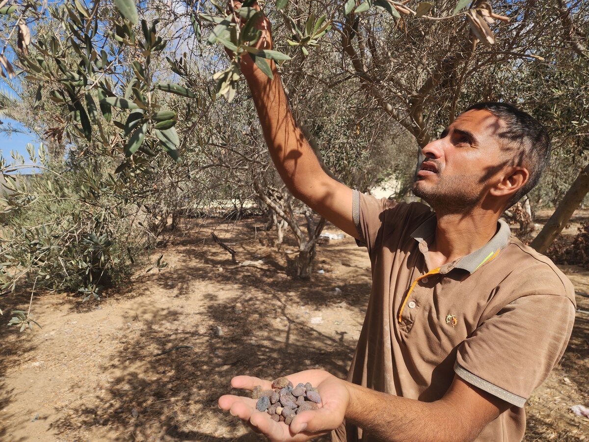 Verschiedene Sorten an Oliven habe er angebaut, mit verschiedenen Vorzügen: Serri-Oliven, aus denen Öl gespresst wird. Schamlai-Oliven, die besonders widerstandsfähig sein sollen. Und Syrische Oliven, die als sehr ertragreich gelten. Der Boden in Gaza, sagt er, sei „ideal für Oliven“: ein Mix aus Lehm und Sand, der das Wasser für längere Zeit hält und so an die Bäume abgibt.