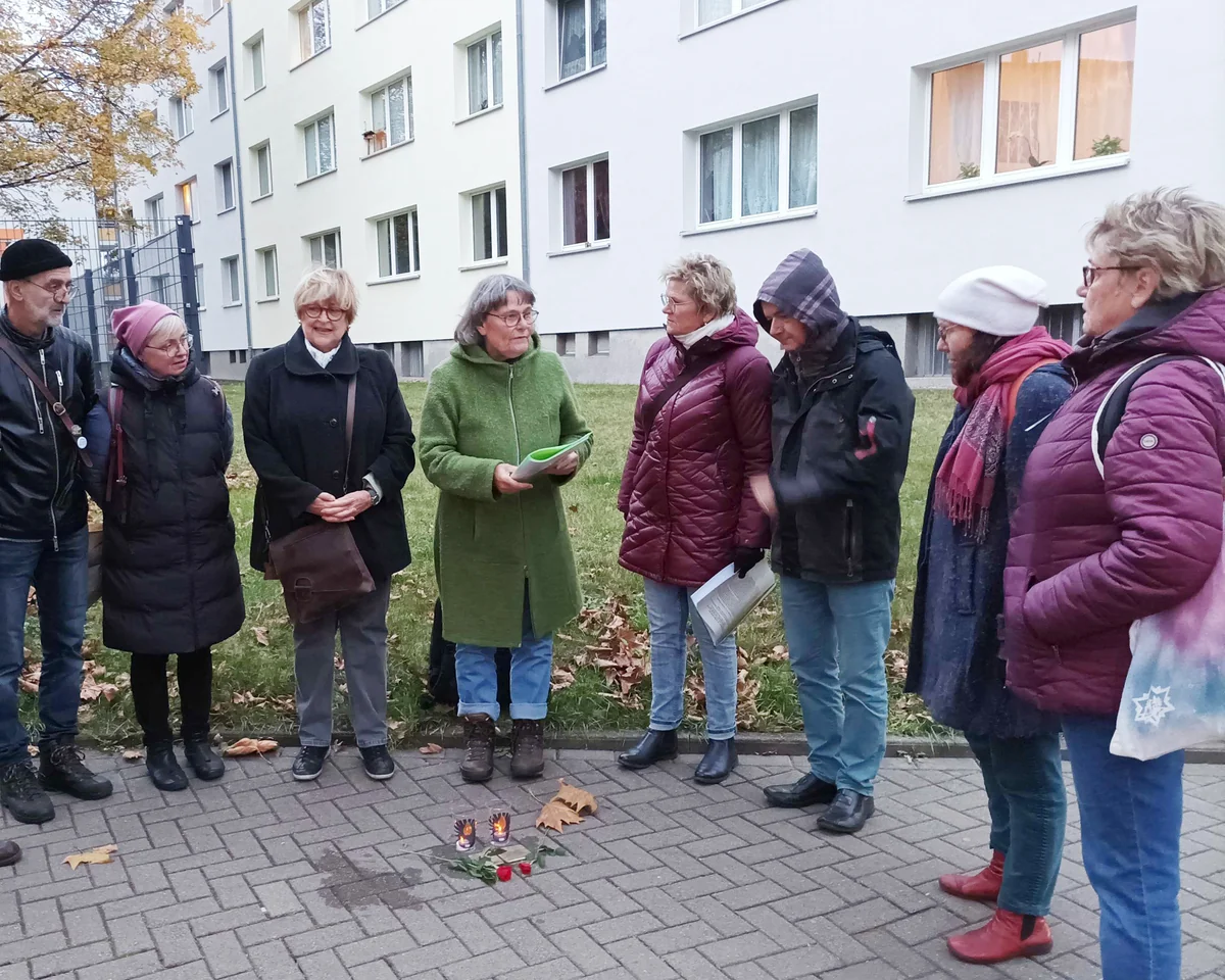 Gustav-Freytag-Straße 3. Bevor sie singen werden, nimmt eine der Omas Blätter aus einer Plastikhülle, liest vor: Marek Muszkatblat, 1909 in Warschau geboren, Sohn einer jüdischen Kaufmannsfamilie. Der Wind wird kühler, erste Regentropfen, alle schauen auf die beiden Stolpersteine im Gehweg, jemand holt Kiesel, damit die elektrische Kerze im Plastikbecher nicht wieder umfällt.