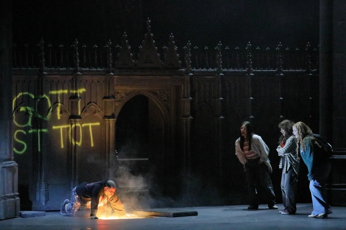 Das erste, was man auf der Bühne klar erkennt, ist ein Schriftzug an einer Kirchenfassade mit Nietzsches Befund „GOTT IST TOT“. Davor versucht ein lebensmüder Alberich, sich zu erschießen. Bis die als junge Aktivistinnen aufkreuzenden Rheintöchter ihn ablenken, ihm etwas vorgaukeln und ihn dazu bringen, ihnen das Rheingold zu stehlen. Eine von ihnen schießt Alberich an. In der Kirche haben die alten germanischen Götter währenddessen begonnen, ihren Altar restaurieren zu lassen.