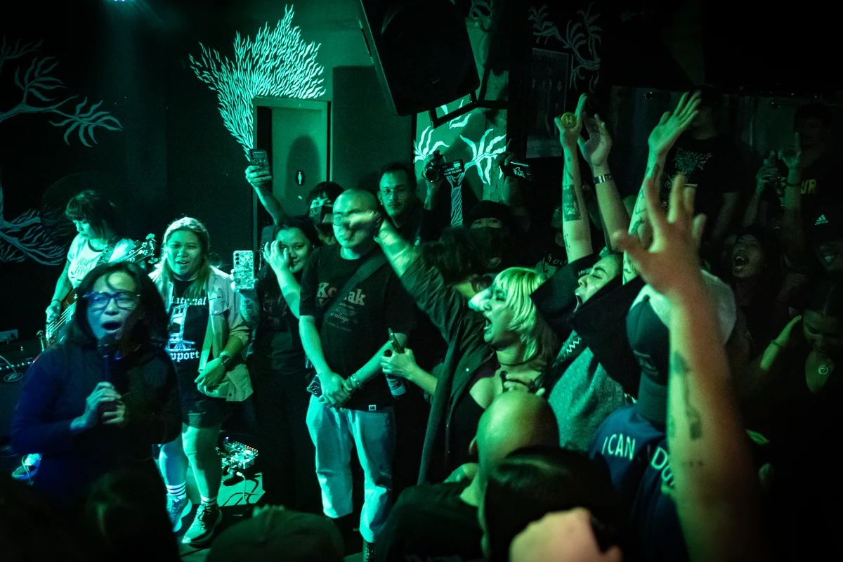 Wieder im Hinterzimmer, nun spielen „Banana Is the Bastard“. Die Sängerin Maria hüpft wie wahnsinnig durch die Menge, schreit ihre Texte durch die gelbe Sturmhaube. Ein musikalisches Chaos, durchzogen von rhythmisch dröhnenden Gitarrenriffs. Immer wieder wird gepoked. Marias politische Ansagen zwischen den Liedern sind nur schwer zu verstehen, sie spricht eine Mischung aus Englisch und Tagalog: Kritik an Trump und der „amerikanischen Besatzung“ der Philippinen sind zu verstehen, und Wut über die Entführung des venezolanischen Ex-Präsidenten Maduro durch CIA-Spezialkräfte Anfang des Jahres.
