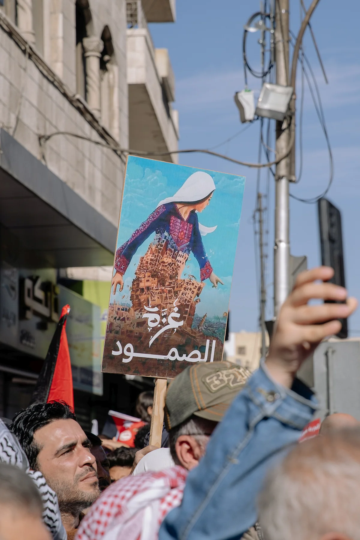 Auf einem der Schilder, das die Demonstrant:innen hochhalten, erhebt sich aus Trümmern von Häusern der Körper einer Frau in einen hellblauen Himmel. Ihr Kopf, auf dem ein loses weißes Tuch liegt, ist zur Seite gedreht, der Blick geht in die Ferne, wo die goldene Kuppel des Felsendoms in Jerusalem zu erkennen ist. Die Frau trägt ein mit Tatreez geschmücktes Kleid. Auf den Trümmern steht „Gaza“, darunter „al-Sumud“.