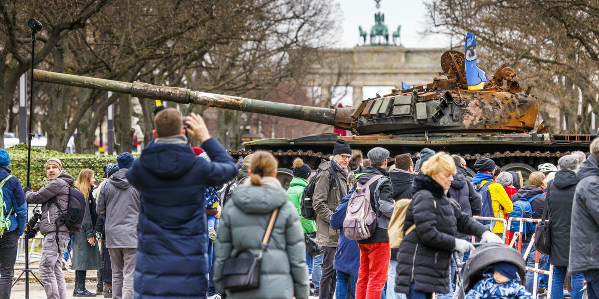 Als zehntausend Menschen am Abend des Jahrestags auf einer Demo Waffen und Solidarität mit der Ukraine forderten, wurde der T-72, der am 31. März 2022 in der Nähe von Kiew auf eine Mine gefahren war, zum Fotomotiv, das kaum einer links liegen ließ. Ein Aktivist kletterte auf den Panzer und forderte Solidarität mit den Aufständischen in Iran. Andere schmückten ihn mit blaugelben Fahnen.