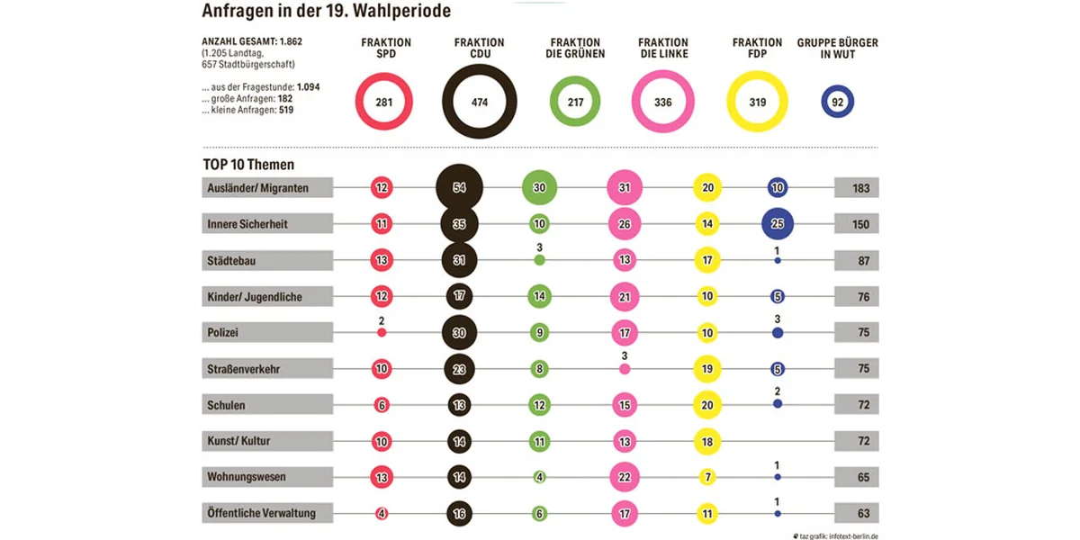 Aber gab es in der vergangenen Legislatur dort zündende Ideen? Was haben die Abgeordneten getan? Die Arbeit von Parlamenten ist schwierig einzuschätzen: Ein Großteil findet in Fraktionen, Ausschüssen und Deputationen statt, jenseits der öffentlichen Debatten, die an den Plenartagen ausgefochten werden. Eine institutionelle Evaluation der Geschehnisse gibt es nicht. Daher hat sich die taz die Dokumenten-Datenbank der Bürgerschaft vorgeknöpft, um herauszufinden, wie dieser öffentliche Streit funktioniert: Welche Themen haben unser Parlament und die Fraktionen bewegt?