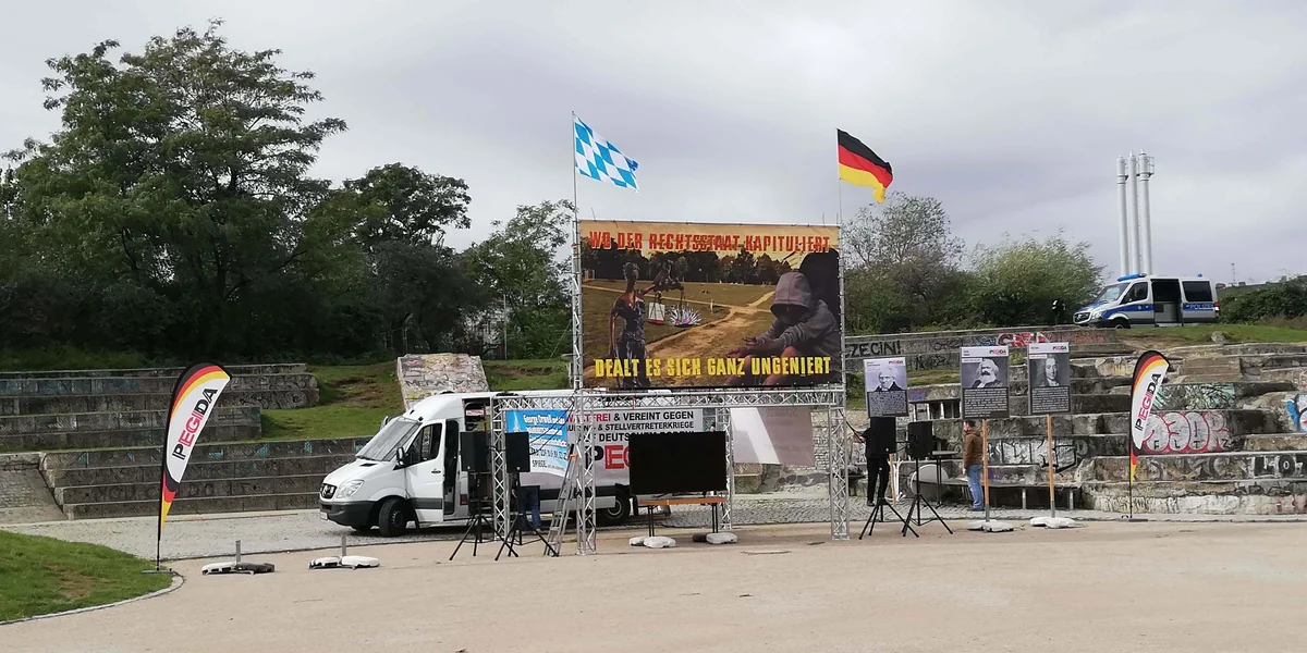 Schon um 10 Uhr morgens bauten die Veranstalter*innen Plakate auf. Auf dem größten heißt es: „Wo der Rechtsstaat kapituliert, dealt es sich ganz ungeniert“, dazu ein Bild des Görlitzer Parks. Den hat die Polizei großräumig abgesperrt. Fünf Teilnehmende meldete Pegida für die Kundgebung an, von Freitag 10 Uhr bis Samstag 9 Uhr. Obwohl die Mobilisierung für die Veranstaltung schwach gewesen sein soll, stehen 140 Beamt*innen der Polizei bereit – auch wegen der erwarteten Gegendemo.