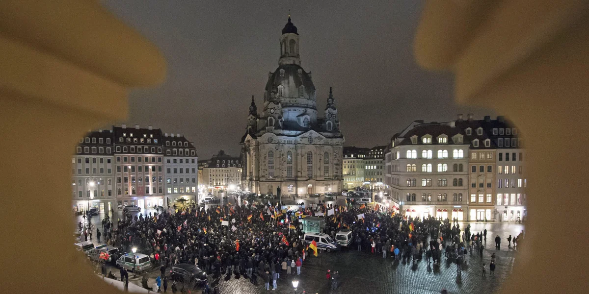 Um kurz nach halb sieben, zum offiziellen Kundgebungsbeginn, wird der Platz voller. An Wischmoppstangen befestigt wehen Deutschlandflaggen. Sie wollen zwar gute Patrioten sein, aber die Standarte ist dann doch noch nicht Standard in deutschen Haushalten. Laut Polizei sind nur 2.000 Pegida-Anhänger gekommen, viel weniger als bei vergangenen Demos, ein Bruchteil der 17.000, die es noch vor zwei Wochen waren.