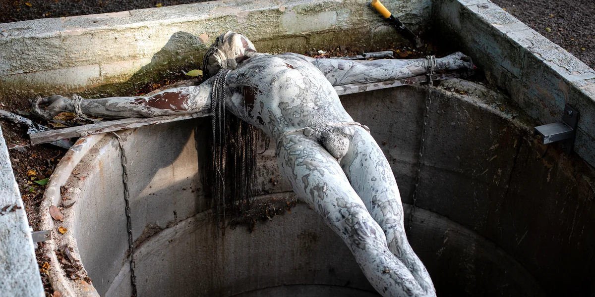 Die Person, die sich aus einiger Entfernung den Besucher*innen nähert, ist zierlich, aber muskulös. Sie ist schwarz und nackt; nur ihre Hüfte schmücken einige Reihen aus Glasperlen, wie sie viele Frauen in Ghana tragen. Lange Metallfesseln hängen an ihren Hand- und Fußgelenken. Sie hat einen Penis. Sie ist über und über mit Lehm beschmiert; Augen, Mund und die langen Rastazöpfe sind völlig verklebt. Mit erschöpften Schritten steuert sie auf einen qualmenden Grillplatz zu und lässt sich langsam auf einem rostigen Metallkreuz nieder, das über dem Grill arrangiert ist. Immer wieder formt sie die Lippen zu einem stummen Schrei, hustet und würgt Lehm hervor. Wartet scheinbar auf den Tod.