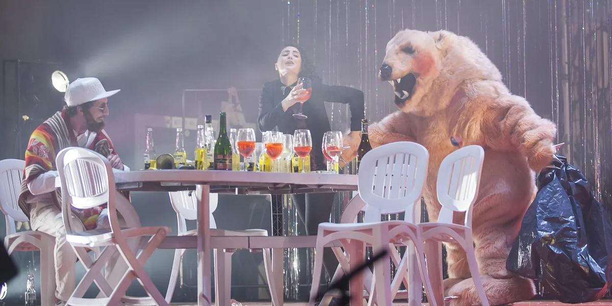Genüsslich, laut und mit viel Klamauk malt das Stück das Entsetzen der Freunde aus, ihre Selbstverteidigung und ihre Schadenfreude untereinander. Das ist einerseits eine böse Karikatur vom hedonistischen Bürgertum, in der es andererseits keinen glaubhaften Gegenentwurf gibt. Die Spielweise setzt auf forcierten Witz, auf Effekte und Tricksereien, die sogleich ins Licht des Unlauteren gesetzt werden. Hungrig nach Glamour werden die Künstler dargestellt und doch voller Misstrauen in die eigene Ästhetik.