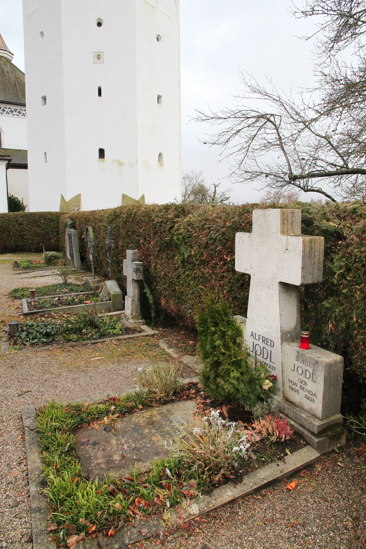 1953 lässt Jodls Witwe Luise das Kreuz errichten. Zuvor lag hier lediglich seine erste Ehefrau Irma. Sie war im März 1944 in Königsberg gestorben, ihre Asche wurde in einem Sonderzug zum Chiemsee gebracht. Als Luise Jodl 1998 mit über 90 Jahren stirbt, wird auch sie auf der Fraueninsel begraben. Kinder hat sie keine, das Grabnutzungsrecht geht an verschiedene Angehörige über, zuletzt ist einer ihrer Großneffen alleiniger Inhaber.