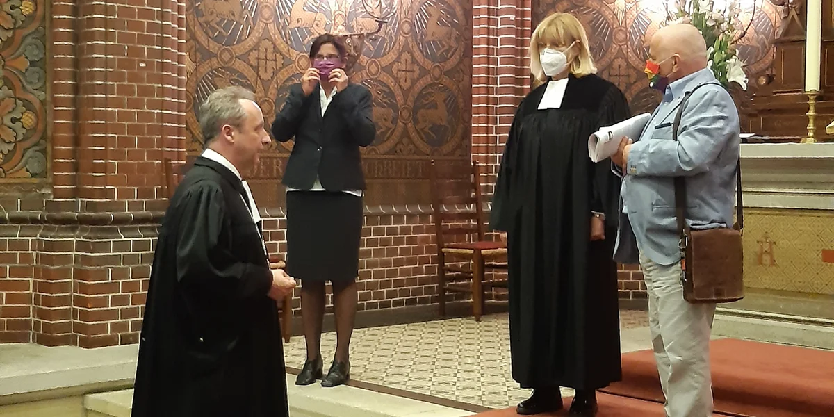 Auch Lothar Dönitz geht es im Kern um Antifaschismus: „Ich bin sehr berührt, dass der Bischof in seiner Predigt beides aufgegriffen hat. Den Weltfriedenstag, der am 1. September begangen wird, und den Paragrafen 175, der am 1. September 1935 von den Nazis verschärft wurde“, erklärt er beim Verlassen der Kirche. „Das gehört zusammen.“