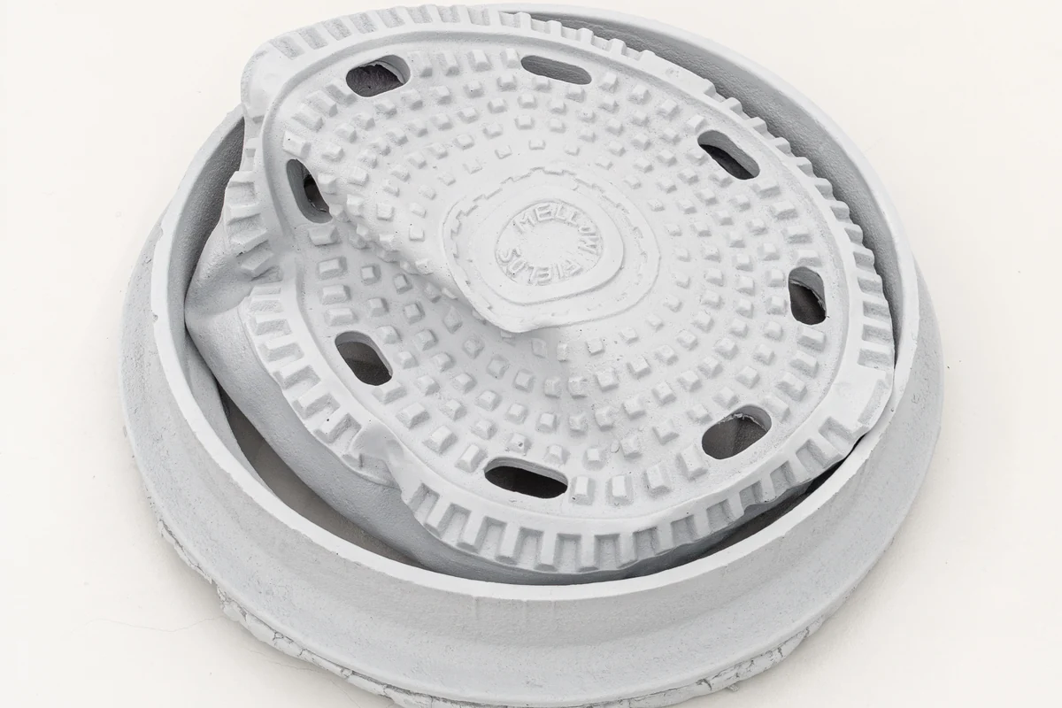 Beim Betreten der Ausstellungsräume der Galerie Kai Erdmann in Berlin-Halensee fühlt man sich erst einmal wie in einer etwas zu groß geratenen und unfertigen Umgebungssimulation eines 3D-Programms. Graue, unmöglich verformte Gullydeckel liegen auf dem ebenfalls grauen Boden der Galerie, in demselben matten Grau steht da ein leeres Billboard gegen die weiße Wand gelehnt.