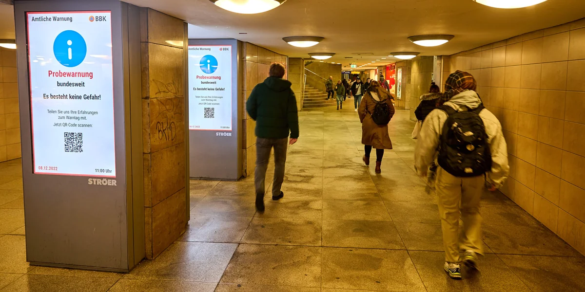 Wie die Bevölkerung im Ernstfall gewarnt werden kann, wurde im vergangenen Jahr am 8. Dezember getestet. Bundesweit schrillten vormittags um 11 Uhr Sirenen. Im Radio und im Fernsehen liefen Warnmeldungen. Die Warnapps Nina und Katwarn wurden aktiviert. Und das Highlight: Cell Broadcast. Mobilfunknutzer:innen erhielten die Testwarnung aufs Handy. Allerdings nur dann, wenn ein passendes Gerät und Update vorlag, die Besitzer:innen sich mit dem Handy in einer Funkzelle befanden und der Flugmodus ausgeschaltet war.