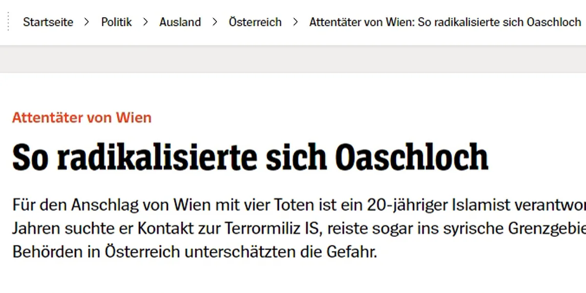 Nun hat sich in den sozialen Medien eine alternative Bezeichnung für den Täter durchgesetzt, die ihm ein aufgebrachter Wiener Grantler in der Anschlagnacht aus dem Fenster entgegenschleuderte: „Oaschloch“ und – eher international – „Motherfucker“. Der Ausruf des unbekannten Mannes avancierte zur Parole des Tages in den sozialen Netzwerken – weil er den unverwüstlichen Geist Wiens einfange, das sich von Terroristen nicht spalten lasse, schrieben manche User*innen nach dem Anschlag.