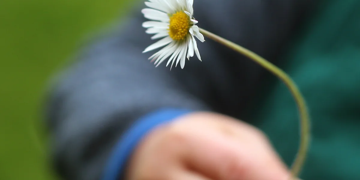 Da geht er. Ein Kind. Ganz bei sich. Ein Kind in seiner Welt. Die Mauer endet, das Kind senkt das Pflänzchen, dreht es leicht, als würde es damit zart der Bewegung eines inneren Gedanken folgen.