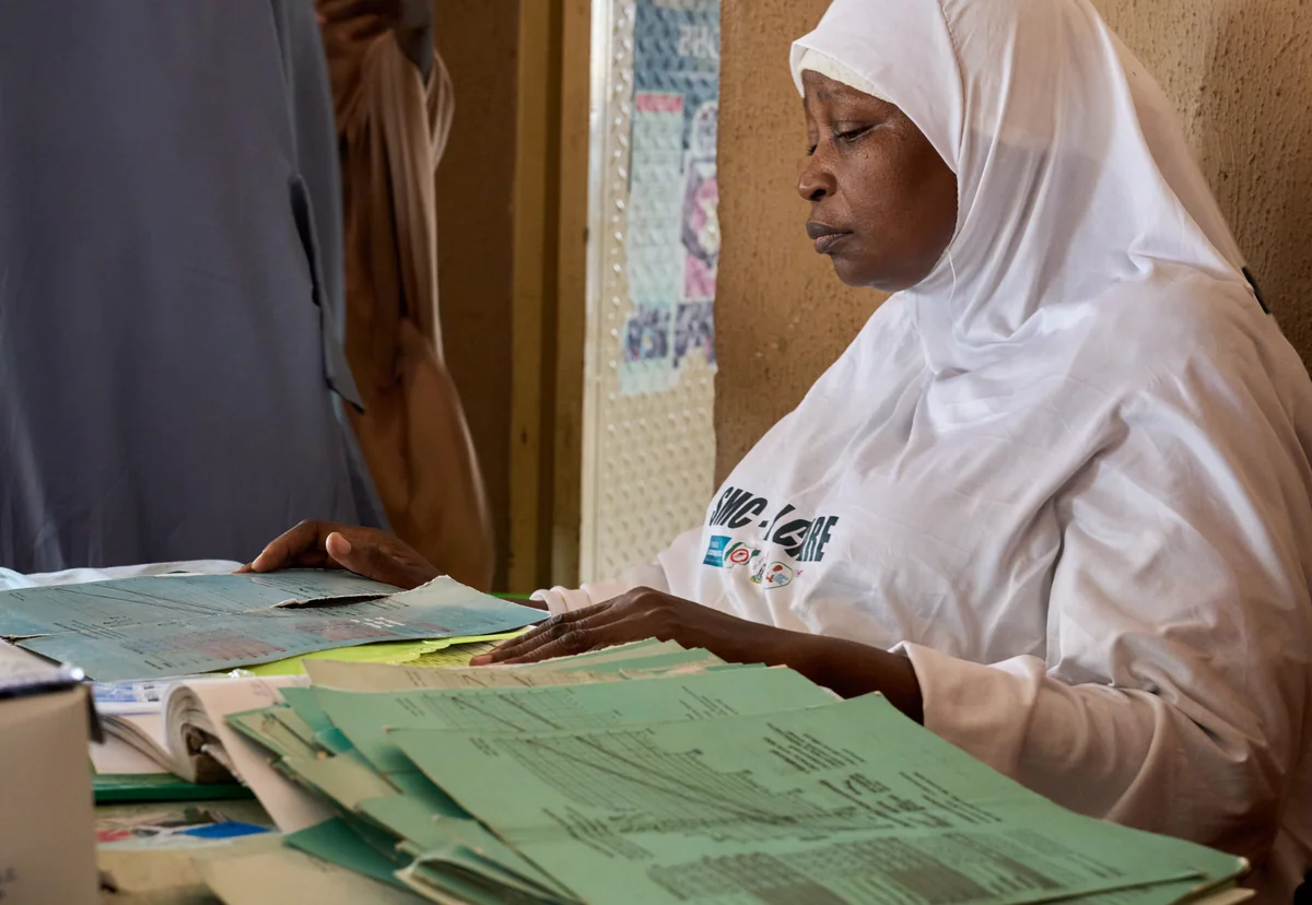 Balkisu Yusuf orchestriert das Geschehen mit fester Hand und Stimme. Die 52-Jährige trägt einen weißen Hidschab, fest umschließt das Kopftuch ihr Gesicht. Auf dem Plastiktisch vor ihr stapeln sich blaue und grüne Impfbögen. Jede Karte steht für ein Kind, jeder Abschnitt darauf für eine Krankheit, gegen die es Vakzine gibt. Im Akkord zieht die Krankenschwester Spritzen auf, pikst damit in Oberschenkel und Arme, träufelt Impfstoff in kleine Münder, tröstet Kinder, trocknet Tränen und spricht Müttern gut zu.