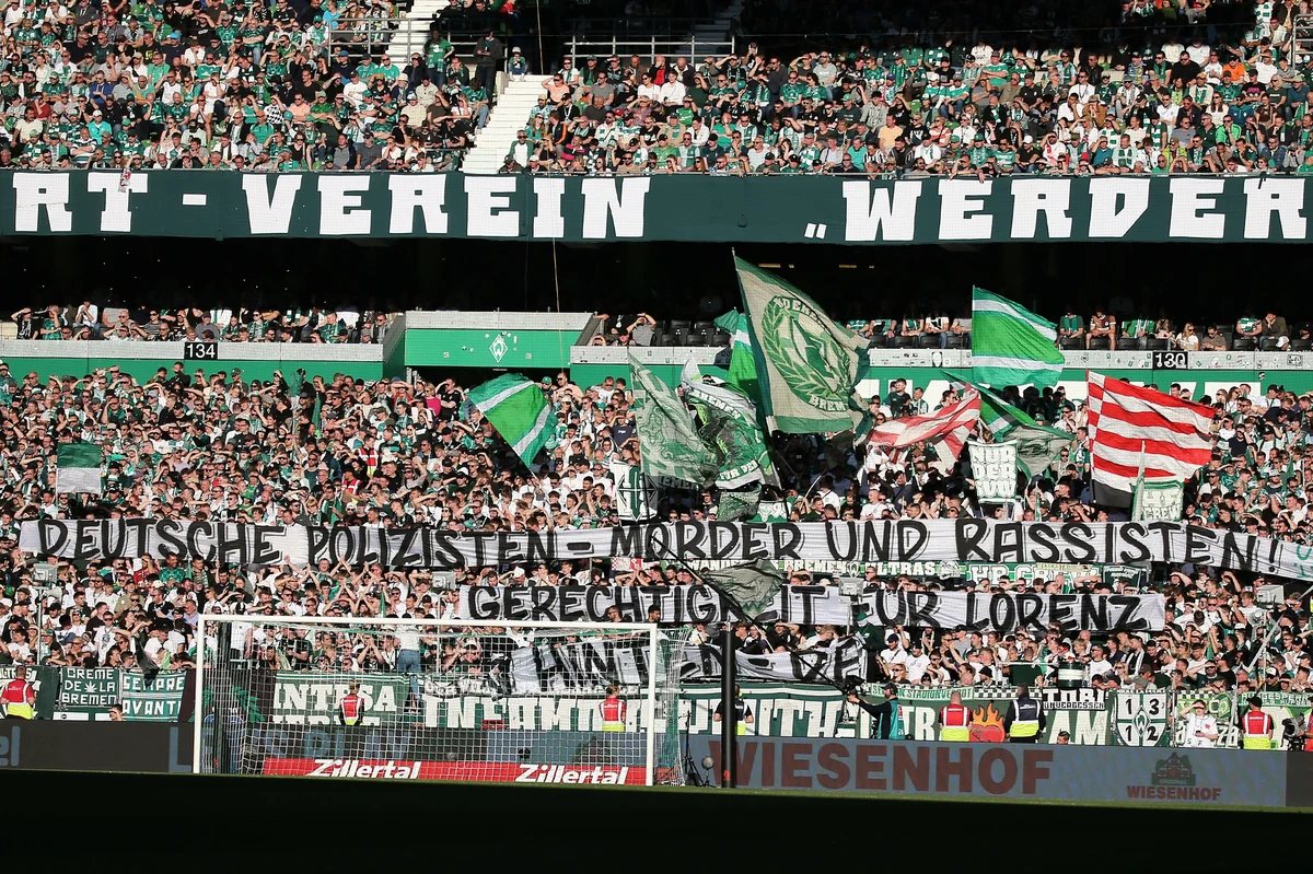 Den größten Protest während der 90 Minuten gab es gemeinsam. Es ging um Lorenz A. aus Oldenburg. Der 21-jährige Schwarze wurde vor einigen Tagen von der Polizei erschossen. Der Werder Anhang hielt ein Transparent mit der Aufschrift „Schüsse von hinten – das war Mord“ hoch, St.-Pauli-Fans skandierten „deutsche Polizisten – Mörder und Rassisten“. Kurz darauf erinnerten die Heimfans an die kommunistische Widerstandskämpferin Else Jahn, die vor 80 Jahren von der SS ermordet wurde.