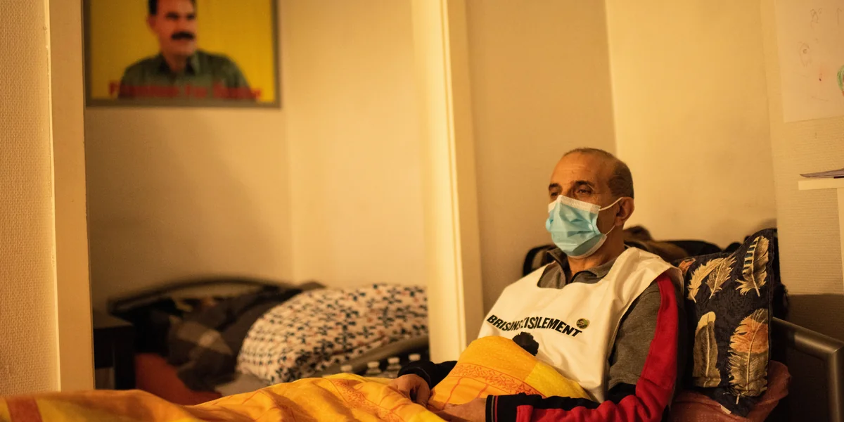 An der Tür zu einem der drei Streikräume ist eine Glasscheibe, von innen verhängt mit einer PKK-Fahne. „Eintritt nur mit Erlaubnis“, steht auf Kurdisch mit Filzstift auf einem Pappschild geschrieben. Und: „Nicht laut sprechen.“ Lärm und Licht sind schmerzhaft für so geschwächte Körper. Der Raum ist abgedunkelt. Weiße Wände, gefliester Boden, sechs Metallbetten, Ikea-Bettwäsche, überall volle und leere Wasserflaschen, es riecht nach Putzmittel. An den Wänden hängen Bilder von gefallenen Milizionärinnen. Alle im Raum tragen Mundschutz. Es sieht aus wie eine Quarantäne-Station. Vor zwei Betten sitzen Männer. Keiner sagt ein Wort.