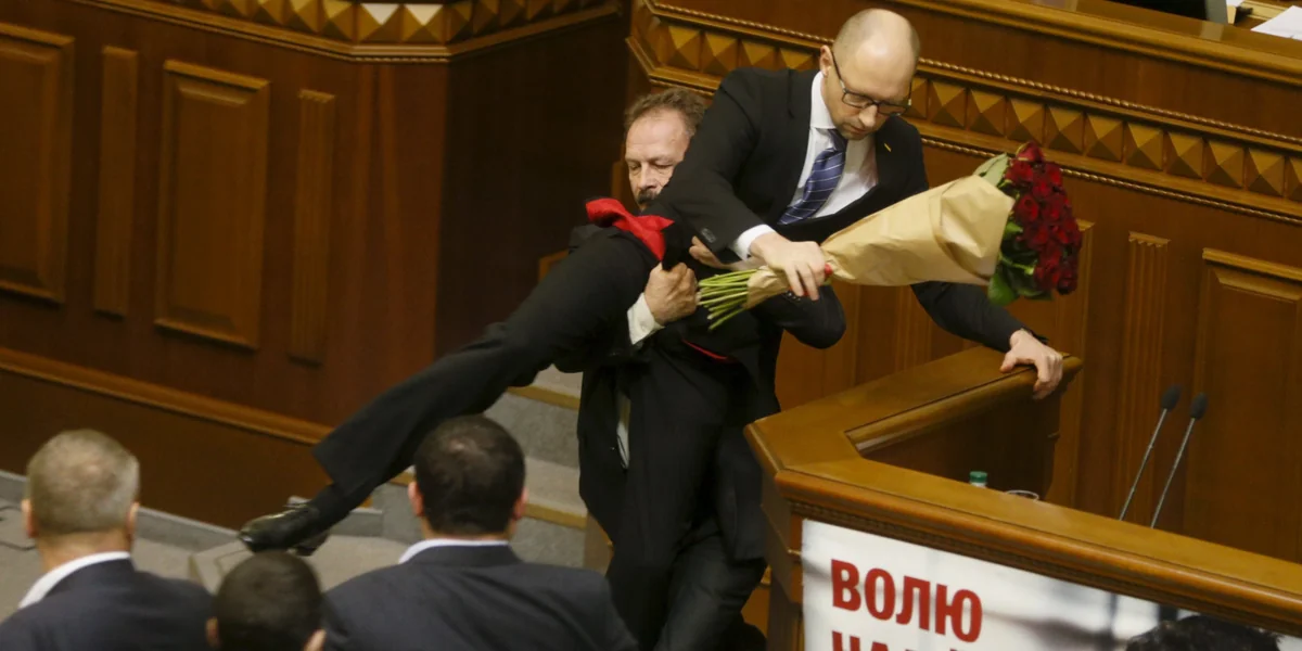 Ein aufgebrachter Abgeordneter versucht Regierungschef Arsenij Jazenjuk aus dem Parlament zu befördern. Foto: reuters