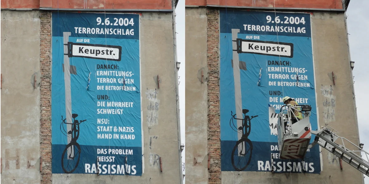 Nun erinnerte das Kollektiv an den Nagelbombenanschlag in der Kölner Keupstraße vor zehn Jahren, mit dem Bild eines Fahrrads, das an einem Straßenschild lehnt. Daneben war zu lesen: „Staat und Nazis Hand in Hand“. „War“ deshalb, weil kurz nach Fertigstellung des Plakats die Polizei mit einem Großaufgebot auftauchte, um die strafrechtliche Relevanz der ungehörigen Behauptung festzustellen und zu beseitigen. Ein Leiterwagen der Feuerwehr wurde gerufen, und mit etwas Amtshilfe ließen die Beamten in Grün besagte Textpassage entfernen. Einsame Spitze in Sachen Livecomedy, eine deutliche Aufwertung der politischen Botschaft. Weiter so!