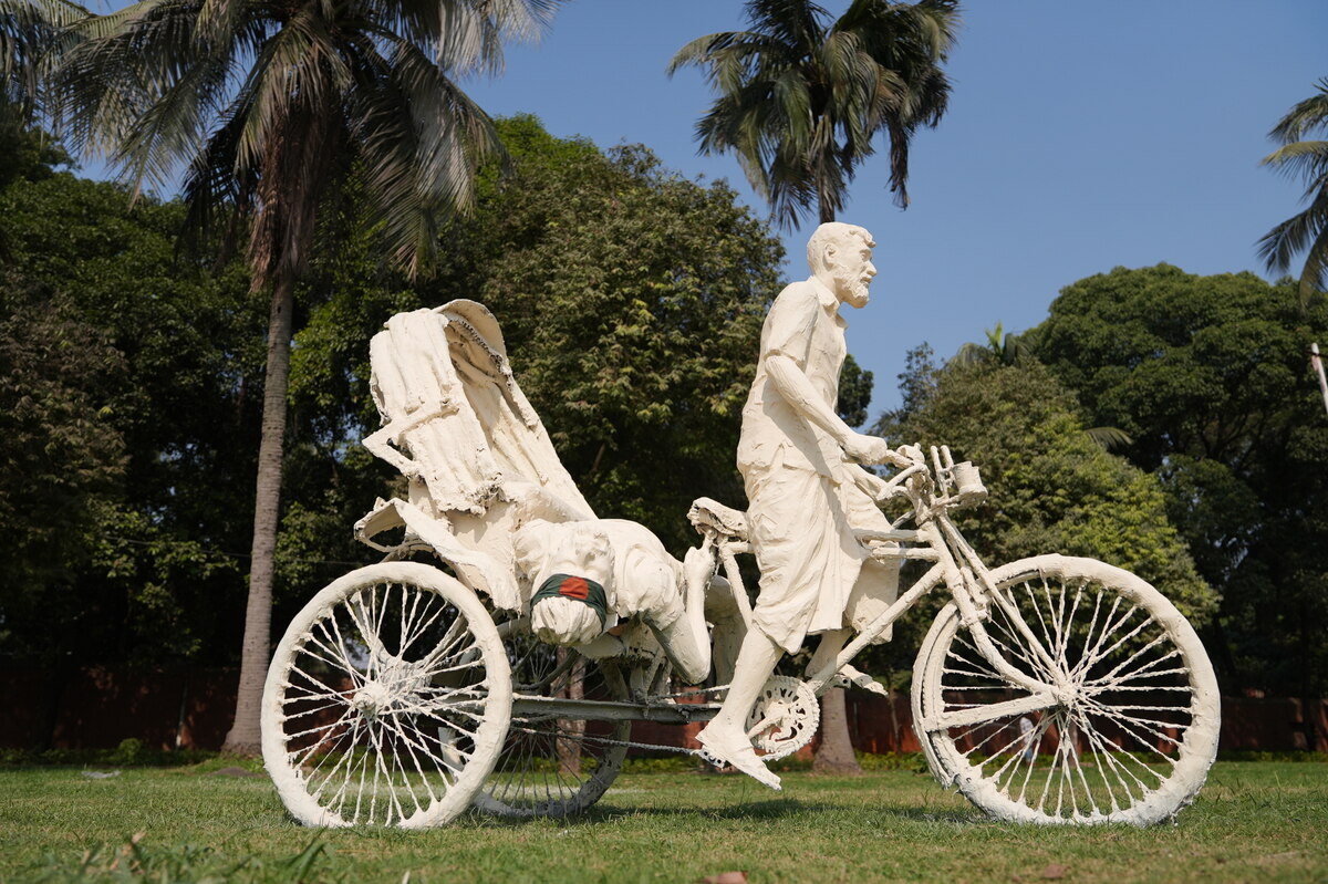„Die Idee dieses Denkmals ist, dass diese Menschen die neuen Eigentümer des Palastes sind,“ sagt Farooki. In seitlichen Beeten wurden nach ikonischen Fotos lebensgroße Skulpturen von Menschen erschaffen, die während der Revolution berühmt wurden: eine Schülerin, die sich nur mit einem Cricketschläger bewaffnet unter die Protestierenden mischte, ein Riksha-Fahrer, der die Leiche eines Ermordeten zu dessen Familie brachte…