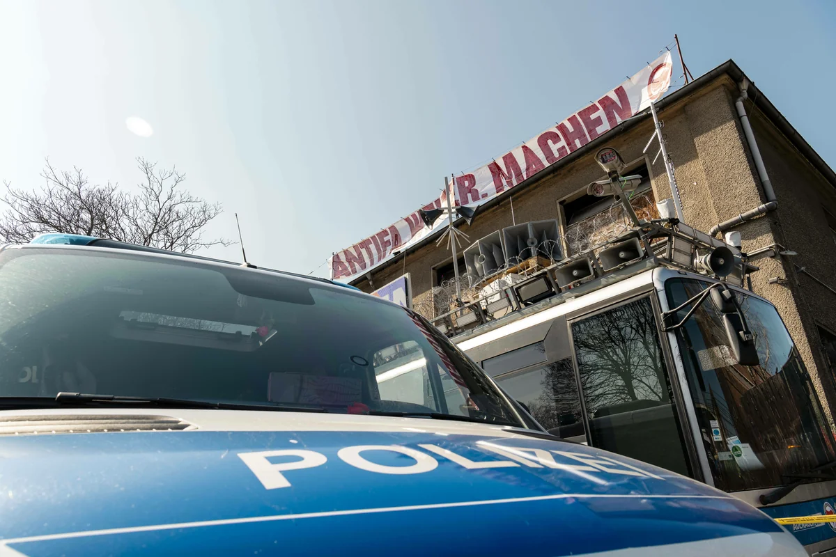 Der umgebaute Bus in Polizeioptik, mit Warnsirenen, Nebelmaschine und Kameras, der eine Beweissammlung für die Verfassungswidrigkeit der AfD mit sich führt, begleitet seit dem AfD-Parteitag in Riesa im Januar Proteste – genauso lange schon arbeitet sich die Polizei an ihm ab. Am Samstag war der „Adenauer SRP+“, der an das Verbot der „Sozialistischen Reichspartei“ 1952 erinnern soll, auf dem Privatgelände des Clubs abgestellt.