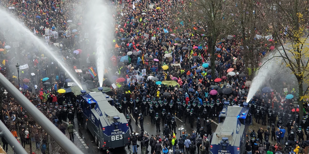 Fünf Wasserwerfer waren am Mittwoch über mehrere Stunden im Einsatz. Dass viele Demonstrant*innen dennoch nicht zurückwichen, ist einerseits auf ihre Radikalisierung zurückzuführen – ihre zum Wahn gesteigerte Vorstellung, das Infektionsschutzgesetz, das gleichzeitig im Bundestag verabschiedet wurde, schaffe die Grundrechte ab.