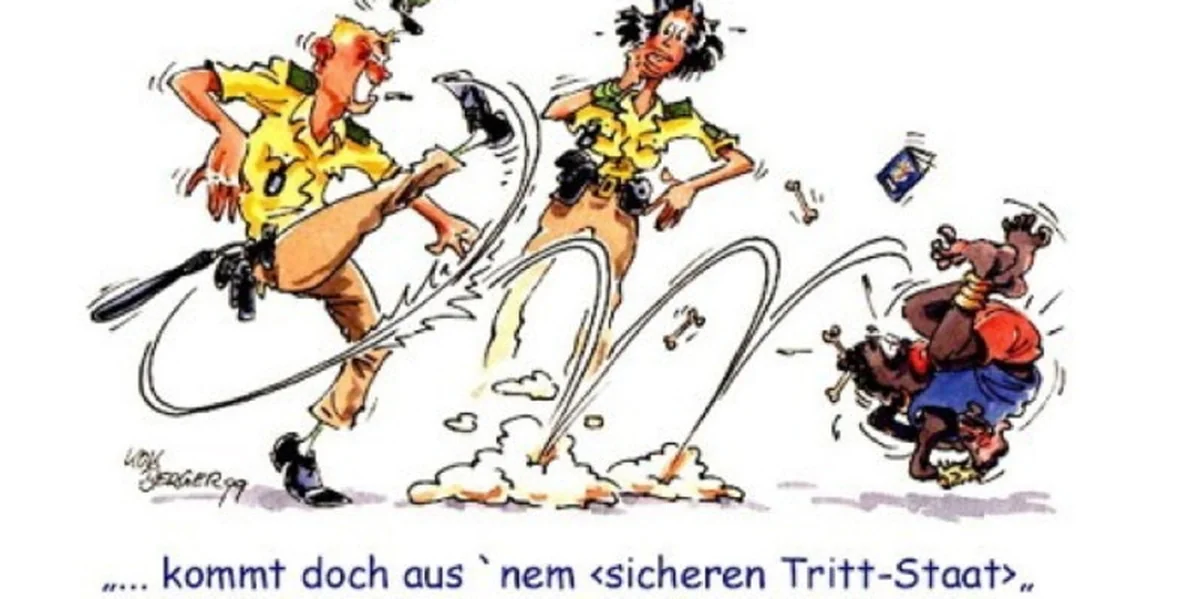 Die Karikaturen, die der taz vorliegen, zeigen unter anderem einen unglücklich drein blickenden Affen und zwei ratlose Polizisten auf der Wache. Unter der Zeichnung heißt es: "Er behauptet nicht aus dem Zoo sondern dem Asylantenlager zu stammen." Auf einem anderen Motiv sind mehrere Frauen im Tschador zu sehen – unterschrieben mit „Schleierfahndung?“ Ein Bild, das einen Schwarzen zeigt, dessen Fingerabdrücke genommen werden, ist mit dem Satz "Bei ihm brauchen wir keine Druckerschwärze. Es reicht, ihm die Finger anzufeuchten" unterschrieben. Und unter einer Zeichnung, die einen Schwarzen zeigt, der von einem Polizisten einen Fußtritt bekommt, steht: "Kommt doch aus nem sicheren Tritt-Staat“.